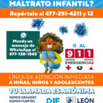 Si vives en León y conoces algún caso de maltrato infantil, puedes denunciarlo al teléfono 477 251 4211 y 12, enviar un WhatsApp al teléfono 477 128 1845, o bien, llamar al 911. Tu llamada es anónima.