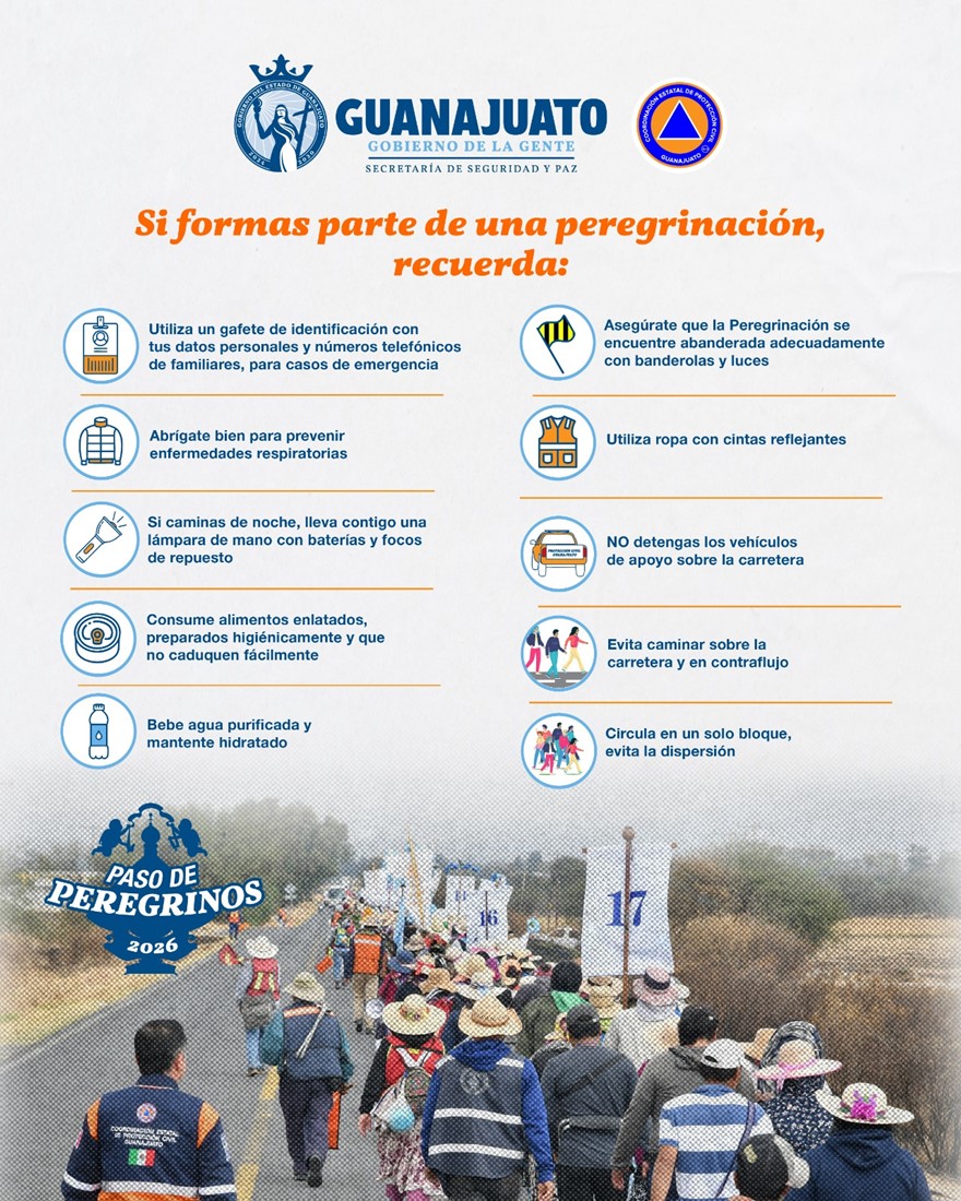 La Coordinación Estatal de Protección Civil de Guanajuato dio a conocer que se prevé que más de 300 mil peregrinos atraviesen 33 municipios de la entidad. Ante ello, hizo un llamado a todos los automovilistas a seguir las recomendaciones para reducir posibles riesgos.